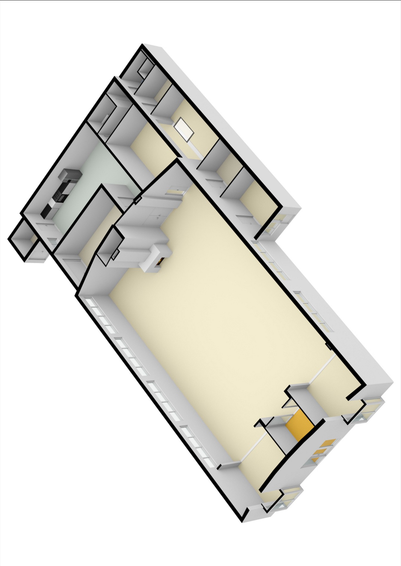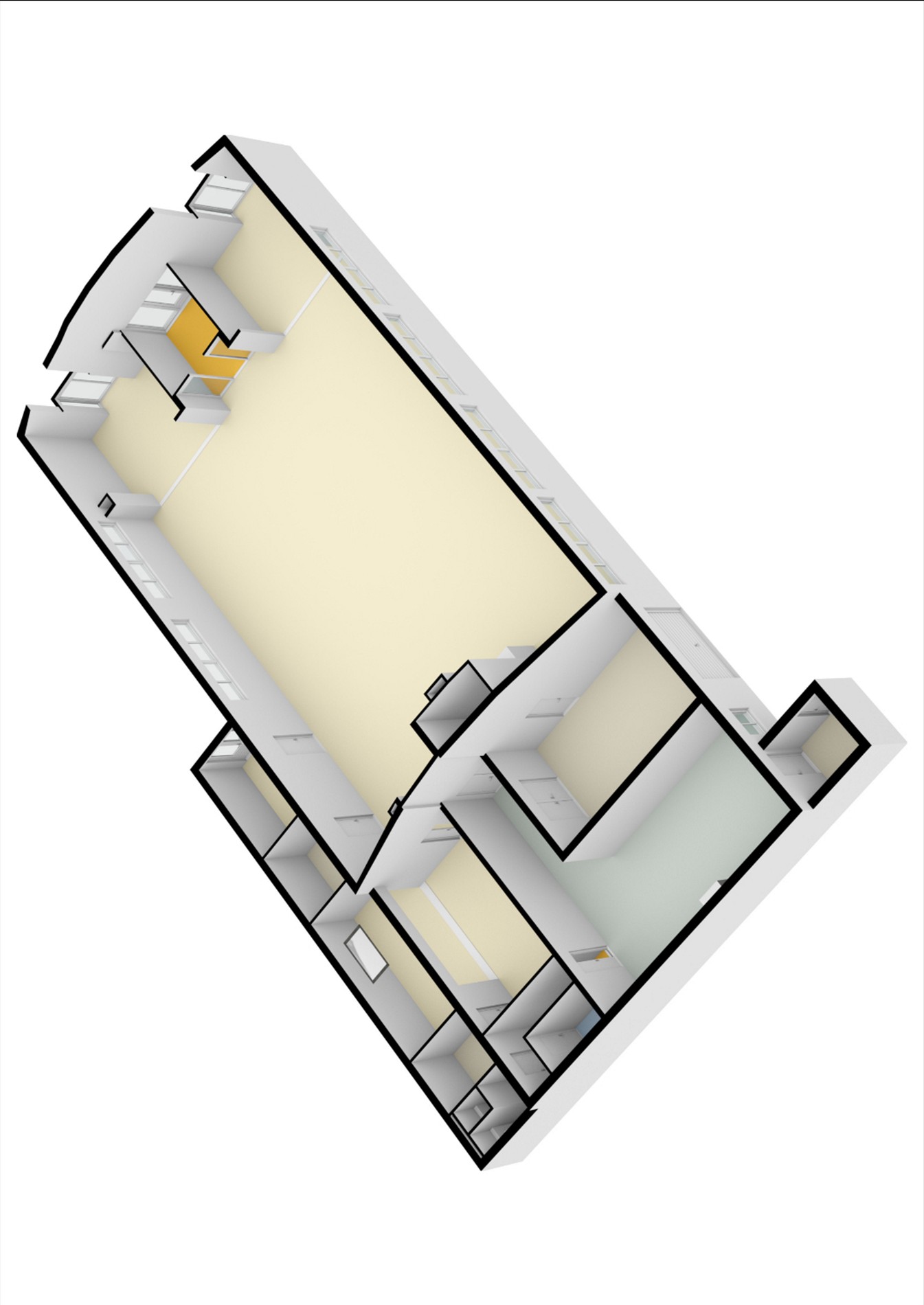 Entree/hal (ca. 10m2) met tussendeur, centrale hal (ca. 232m2) met aan de voorzijde van het gebouw nog 2 open kantoorruimtes (beide ca. 20m2), een separate kantoorruimte (ca. 11,5m2), een technische ruimte (ca. 8m2) en een vergaderruimte van maar liefst ca. 36m2 met toegang tot een berging (ca. 6m2).