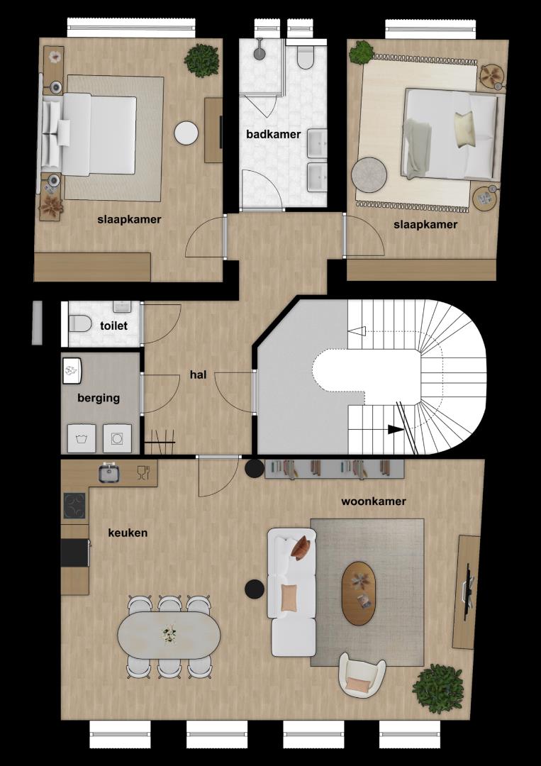• Tweede verdieping: Ruime hal, toiletruimte, een sfeervolle woonkamer van ca. 50m² met open keuken, twee ruime slaapkamers van ca. 21m² en 17,5m², een moderne badkamer van ca. 7m², en een handige bergruimte met opstelling voor witgoed en warmtepomp.