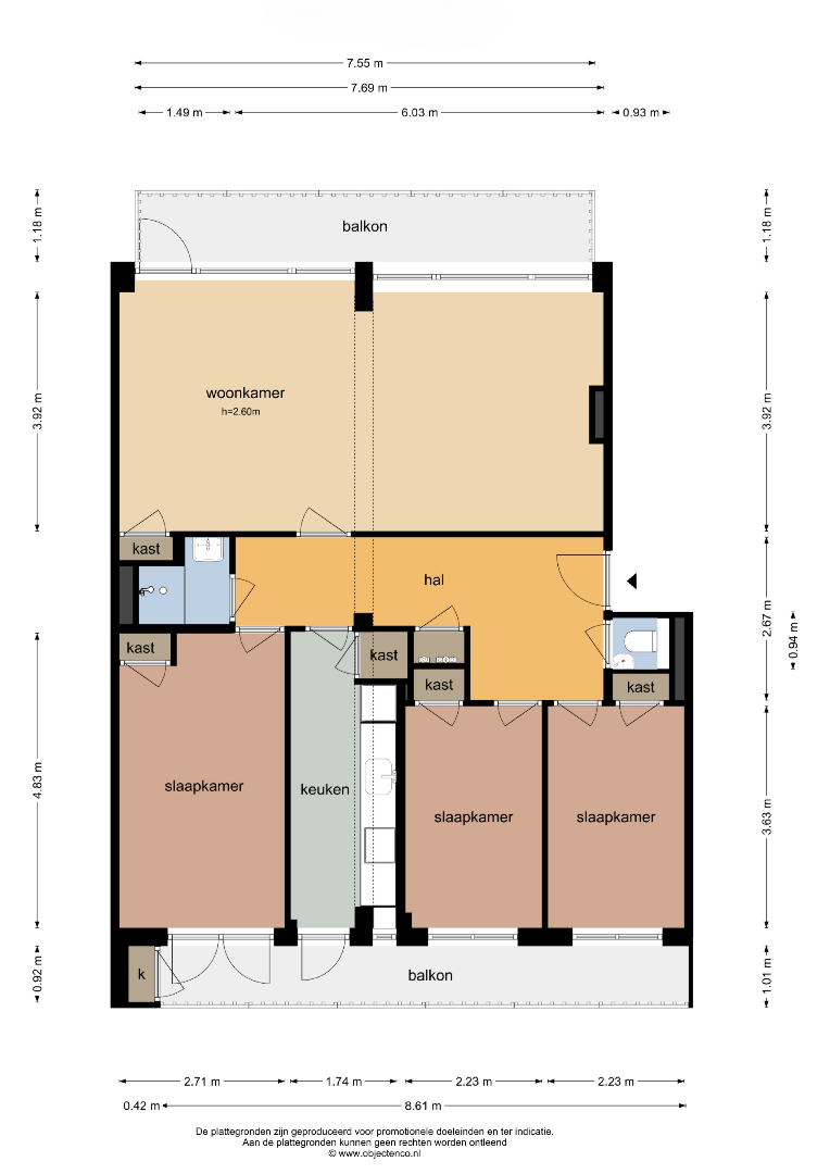 Via de royale entree/hal (ca. 12,5 m²) zijn alle vertrekken bereikbaar. De lichte en ruime woonkamer (ca. 30 m²) is voorzien van grote raampartijen en biedt toegang tot een ruim balkon van ca. 9 m². De dichte keuken (ca. 8,5 m²) beschikt over een eenvoudig keukenblok, witgoedaansluitingen en veel praktische opbergruimte. Het appartement telt drie slaapkamers van ca. 13 m², 8 m² en 8 m², allen voorzien van handige inbouwkasten. Vanuit de keuken en de grootste slaapkamer is een tweede, breed balkon van ca. 8,5 m² bereikbaar. Verder is er een badkamer met douche en vaste wastafel en een separate toiletruimte met fontein.
